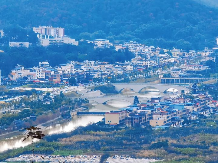黃崗山俯瞰韶城,兩江間青色山丘即帽子峰。黃思偉 攝