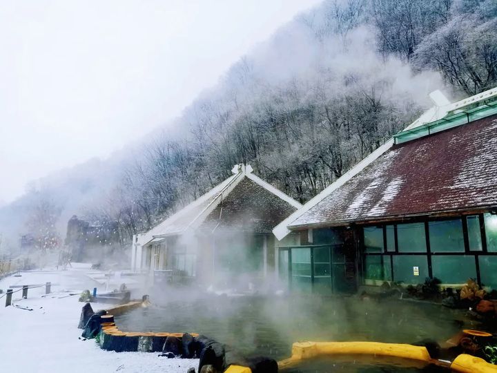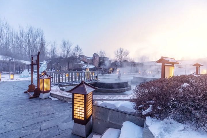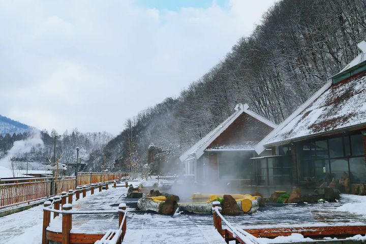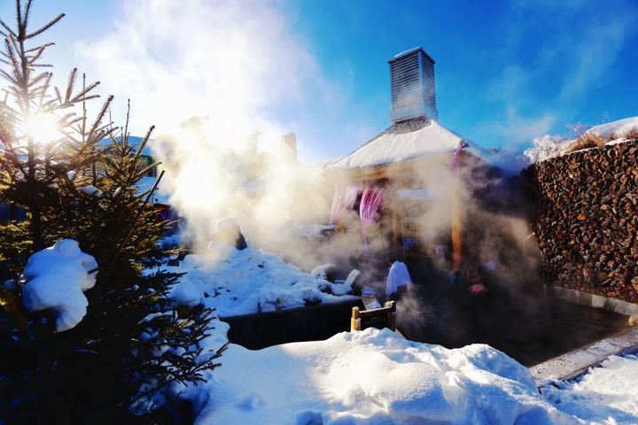 置身高海拔的原始森林,在天然氧吧中輕鬆呼吸,浸泡在溫泉水中,腳下踩著石頭修砌的地面,整個人可以充分融入自然。溫泉裡散發出的溫熱水汽,凝結在周邊的草木之上,形成霧凇,又讓長白山溫泉別添一番景致。