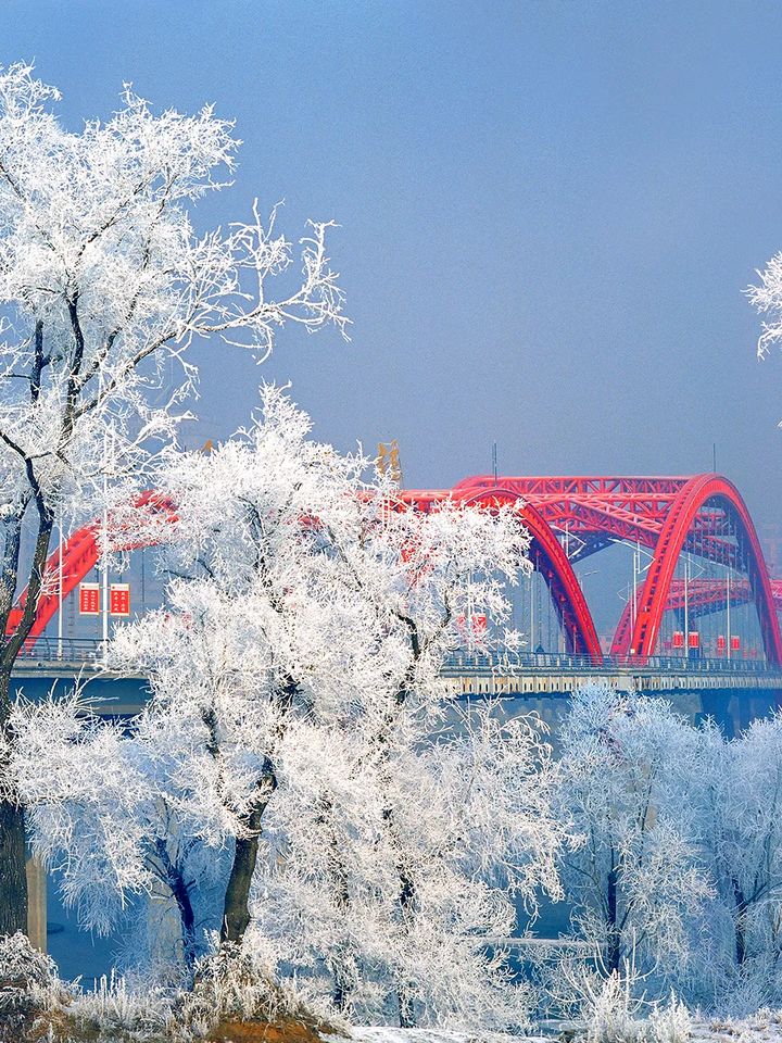 雲霧升騰的松花江上嫵媚曼妙,宛如仙境。縹緲的晨霧中,玉樹瓊枝、銀裝素裹,美麗的霧凇景觀呈現在松江兩岸。驚喜的遊人紛紛湧向松江岸邊,飽覽秀美的霧凇景色。藍天下,江水邊,霧凇仙子伴著遊人歡快的笑臉,冬日的江城詩情畫意,充滿魅力。