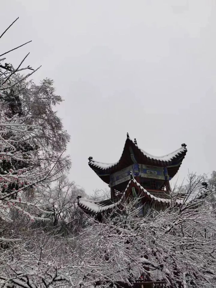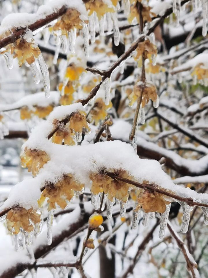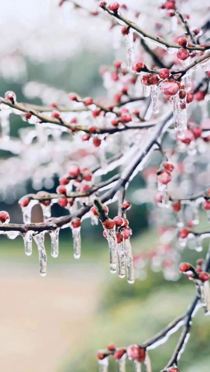 簷流未滴梅花凍,一種清孤不等閒。臘月裡幾場雨雪造成了罕見的雨凇冰掛奇觀,梅花被封凍在晶瑩剔透的冰掛中。冰的通透與梅的絢爛被大自然完美結合,輔以雪的溫柔,讓人迷醉……