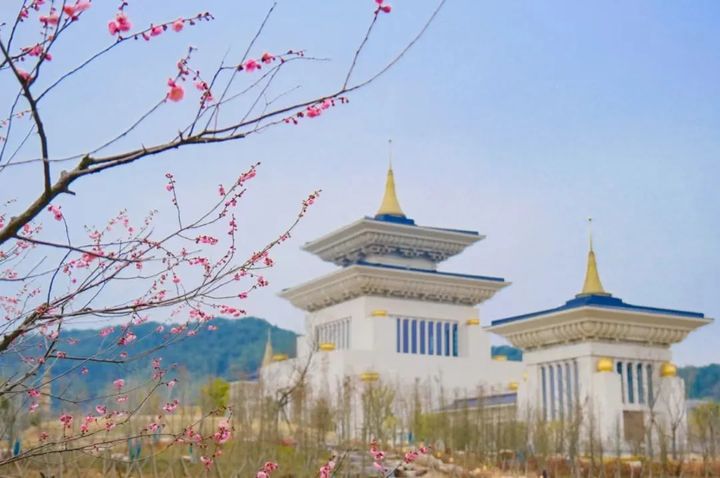 漫步在黃岡東山問梅村的小徑上,兩邊的梅花掩映著唐式的建築,宛如走進一幅古樸畫卷。
