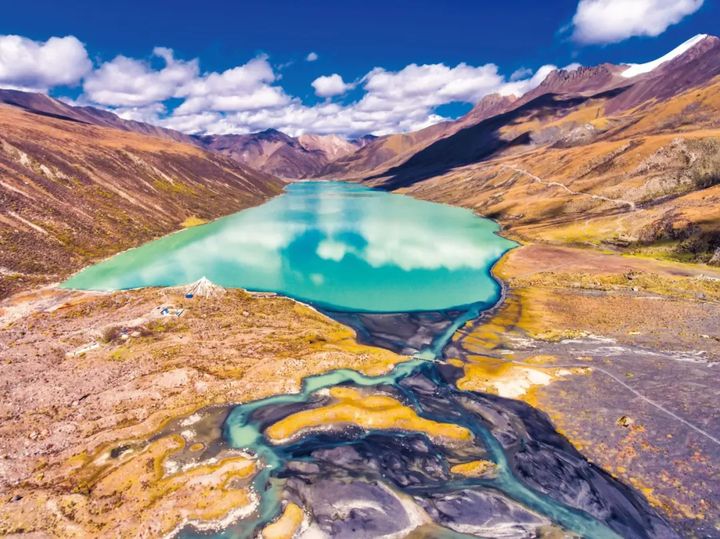 山腳下的薩普湖泊由雪山千年冰雪融化所形成,分為兩部分,靠近雪山腳下的為冰川湖泊,叫作“納木錯”,終年不化,溫婉而又寧靜。