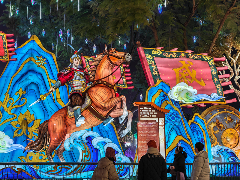 ▲四川自貢自唐代以來便有新年燃燈的習俗,延至清代形成「獅燈場市」「燈竿節」等,擁有悠久的彩燈製作技藝。 1987年,首屆自貢國際恐龍燈會舉辦,為群眾營造了濃厚的節日氛圍,此後成為當地一年一度的節慶盛事。 自貢燈會在2008年被列入國家級非物質文化遺產代表性專案名錄。 1月23日,第32屆自貢國際恐龍燈會開幕,11組超大型燈組、200餘組中小型非遺彩燈精彩亮相。 其中,一組著重表現「馬」元素的彩燈尤為引人矚目,包括「霍去病·汗血寶馬」「關羽·赤兔馬」」郭子儀·青驄馬「岳飛·白龍馬」「戚繼光·赭色名駒」「秦良玉·桃花馬」等,以彩燈技藝展現了英雄人物與傳奇名駒之間生死相依、肝膽相照的深厚情誼,既勾勒出駿馬矯健驍勇、馳騁疆場的雄姿,更傳遞出忠勇無畏、砥礪奮進、保家衛國的家國情懷與昂揚氣節, 讓非遺彩燈技藝與英雄精神相融共生,煥發出厚重的文化生命力。