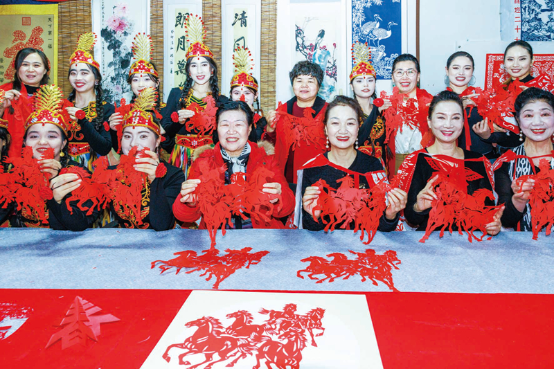 圖為群眾跟傳承人學習剪紙技藝,剪出屬於自己的生肖馬主題剪紙作品。