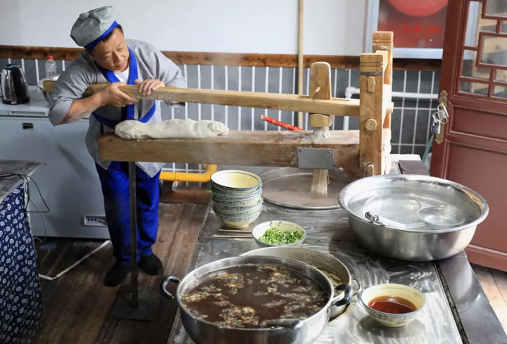 它製作精細,精選優質蕎麥面,按比例摻面、加水、和麵,直至將面揉成光皮,再放入餄餎床中。待鐵鍋中水沸時,用機身壓杆用力向下擠壓,餄餎面就從圓孔中擠出。