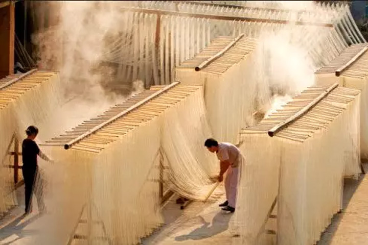 貢麵都是純手工加工,一大坨麵團經過揉粉、開條、打條、上筷、上架、拉麵、盤麵等10多道工序,逐步做成白如銀、細如絲的貢麵,手法令人眼花繚亂,讓人覺得拉麵師傅的手藝在他們面前簡直是“小巫見大巫”。