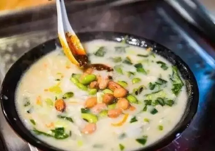 接著,一碗汁稠味美、酸香撲鼻的漿麵條就出鍋了,再根據個人口味配以熟花生米、芹菜丁、辣椒油、韭花等佐料,看著就讓人流口水。