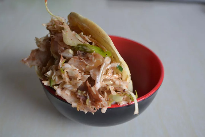從爐中拿出皮薄酥脆的餅,用刀把餅從中間劃開,然後把調好的豬頭肉、黃瓜、白菜等,滿滿的裝入整個餅內,吃起來讓人覺得超級過癮,垂涎欲滴。吃過的人,三天不知肉味,沒吃過的人,永遠不知道啥叫顧縣肉合。