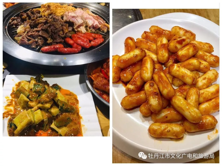 辣白菜、打糕、冷面、大醬湯、辣椒和烤肉等。其中最具代表的是打糕、冷面、泡菜,他們經常吃羊肉串和五花肉。由於牡丹江是朝鮮民族的聚居地,所以在牡丹江還可以吃到非常正宗的朝鮮族美食。