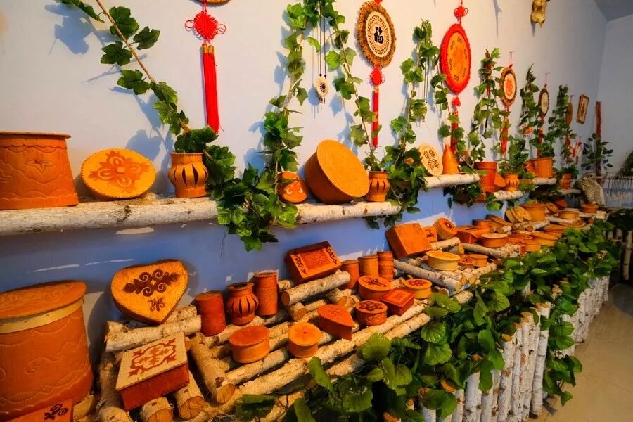 在並不算大的空間內,各種精緻可愛的樺皮製品或錯落有致地懸掛在白牆上,或看似隨意地擺放在同色系的木製展台上,畫面十分溫馨。該樺皮手工藝廠以鄂倫春族樺皮製作藝人張玉霞為主體,吸納了其他鄂倫春族婦女加盟,主要生產樺樹皮手工飾品,比如眼前的花瓶、嫁妝盒、茶具、樺皮船、搖籃、煙盒、果盤、筆筒等應有盡有,每個小物件上都刻有美麗的圖案和花紋,並就地取材被塗上了各種顏色,目前年產量2萬件。
