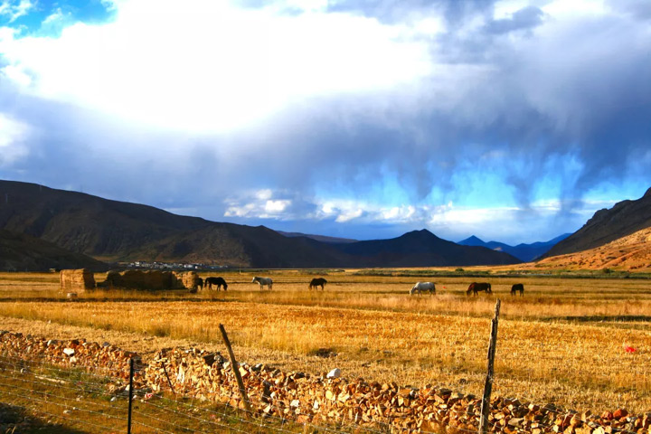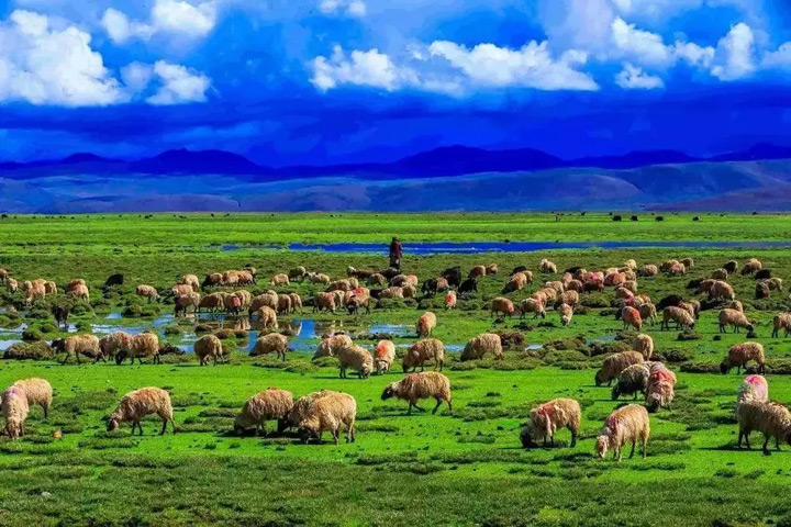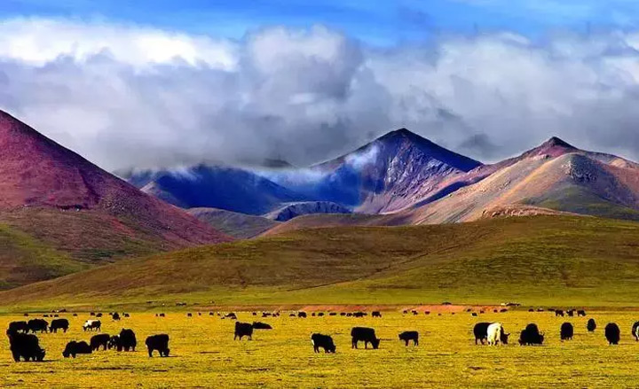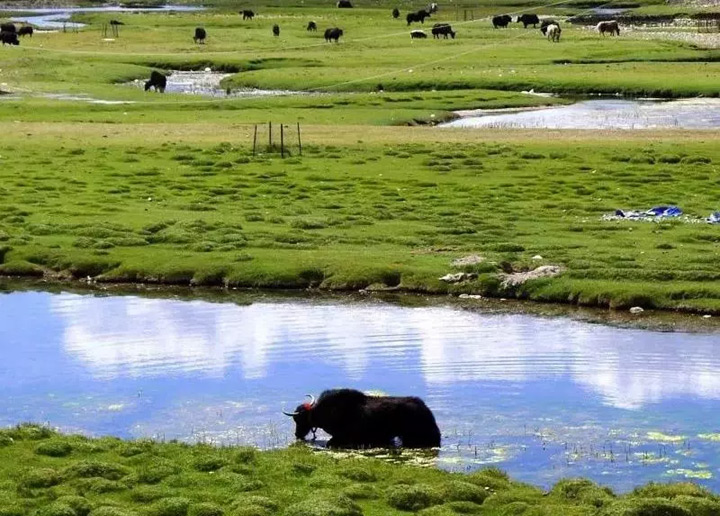 每當盛夏,草原上開滿五顏六色的小花,素有'五色草甸'之稱。生活在這裡的犛牛和綿羊素有“喝的是礦泉水,吃的是蟲草”犛牛的美稱,其美味可想而知。