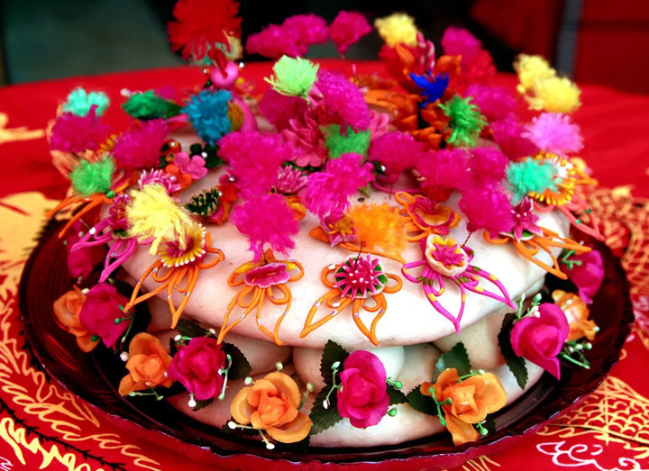 最早的麵塑藝人都是村裡心靈手巧的捏花能人。誰家要是有事,就會提前將這些巧婦請到家中,一起捏各種各樣的花饃。那時候,為鄉鄰幫忙,大都是義務相助,不收取任何費用。但隨著時代的發展,手工饃店也在滾滾的經濟浪潮中應運而生,精明的捏花能人們將手藝與民俗文化緊密相連,以麵塑藝人的身份,創造了節日花饃、婚嫁花饃、壽誕花饃、喪葬花饃、上樑花饃、喬遷花饃等較為完整的花饃體系。滿足了人們在喜喪節典日常交往各種活動的需求。