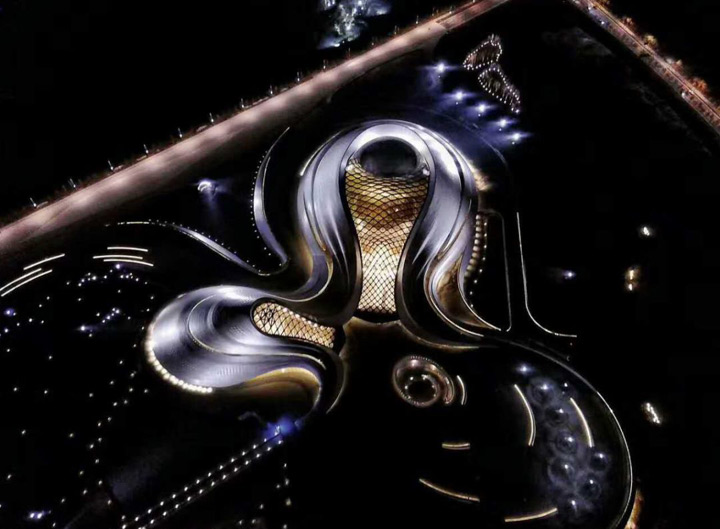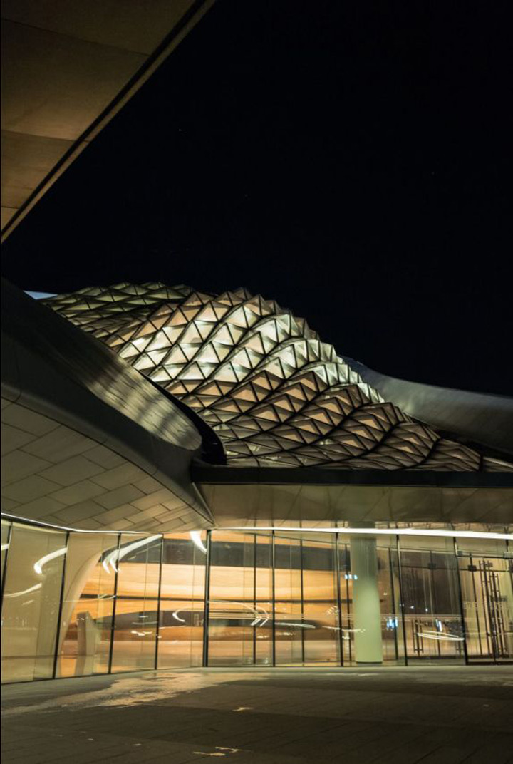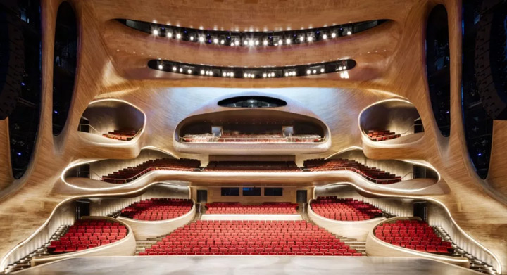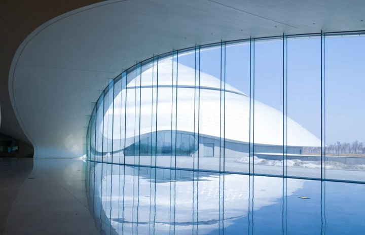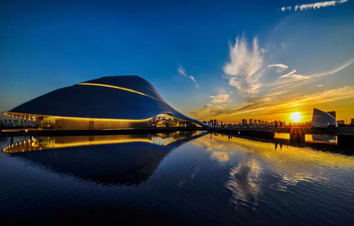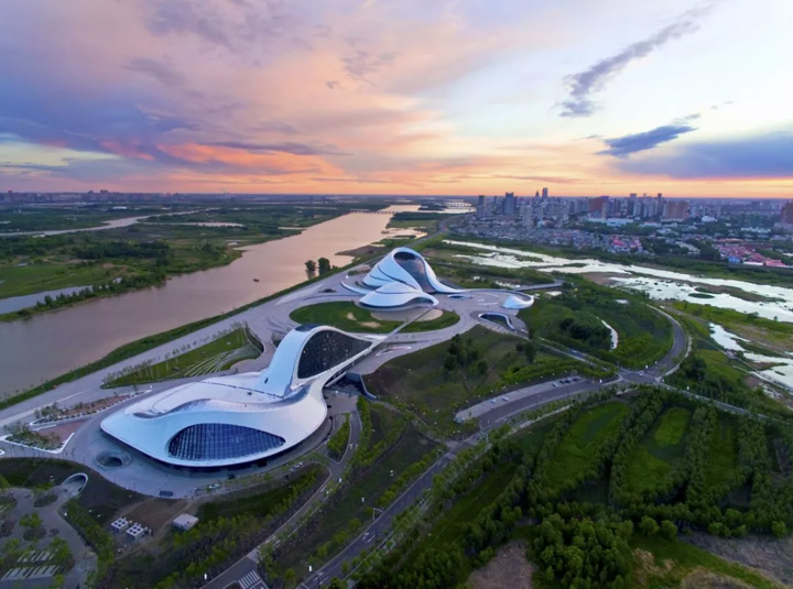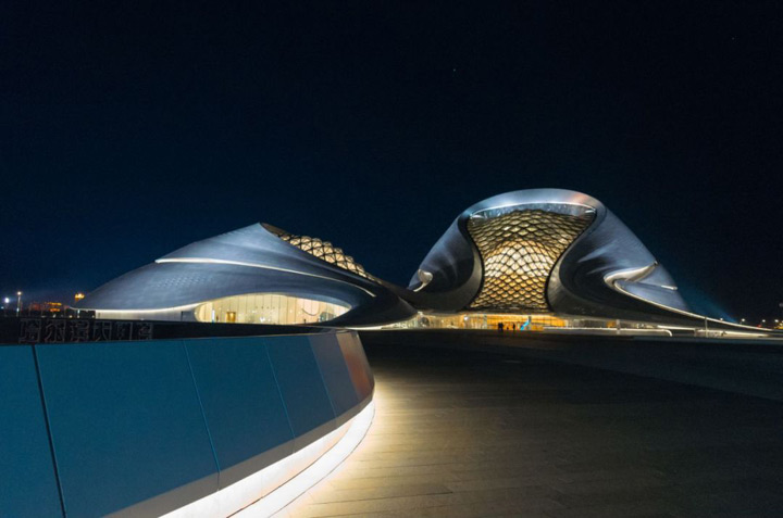 這座坐落於哈爾濱市松北區的文化中心島內,包括1600座大劇院、400座小劇場的建築採用了異型雙曲面的外型設計,是哈爾濱的標誌性建築,體現北國風光大地景觀的設計概念。劇場內採用的多島式看臺的流線造型與建築外造型的整體風格相統一,既美觀又新穎。