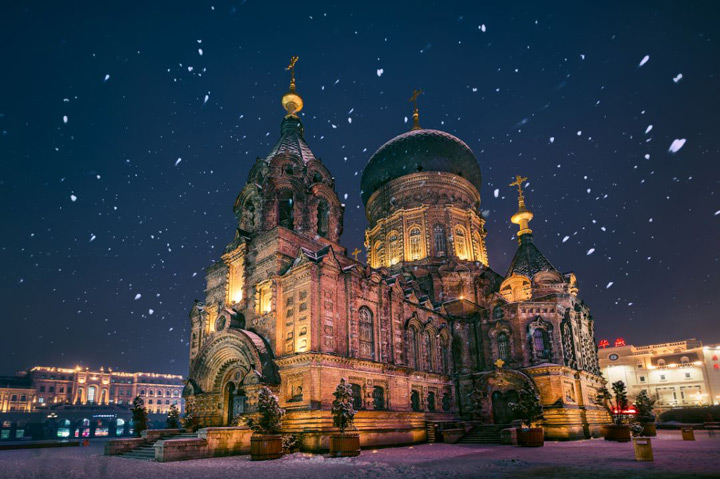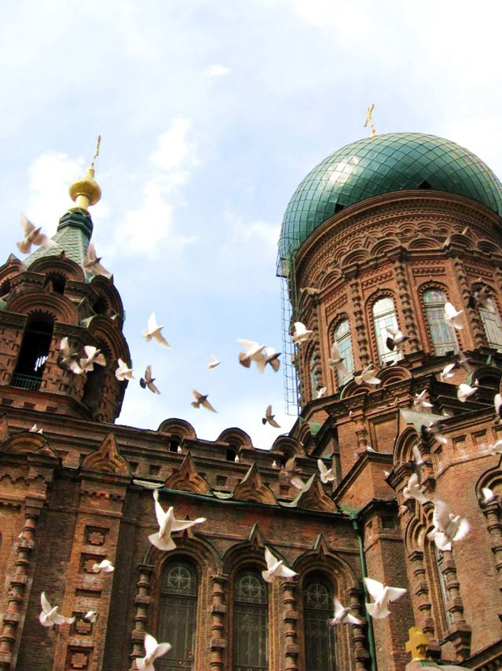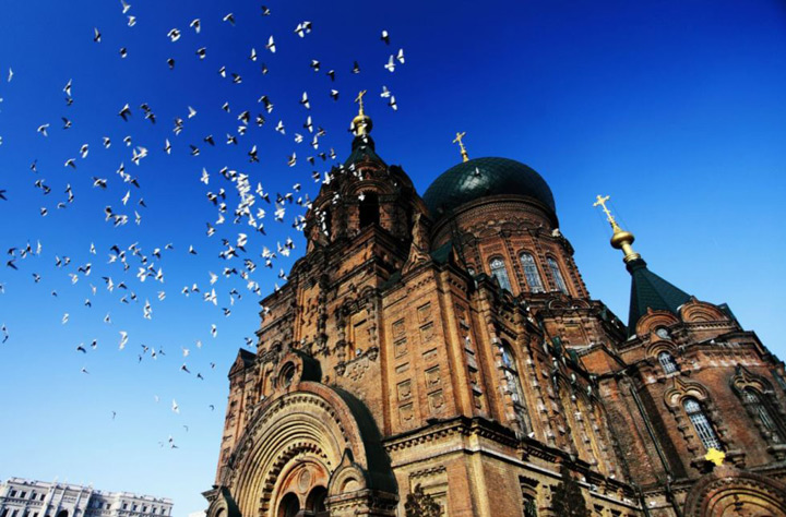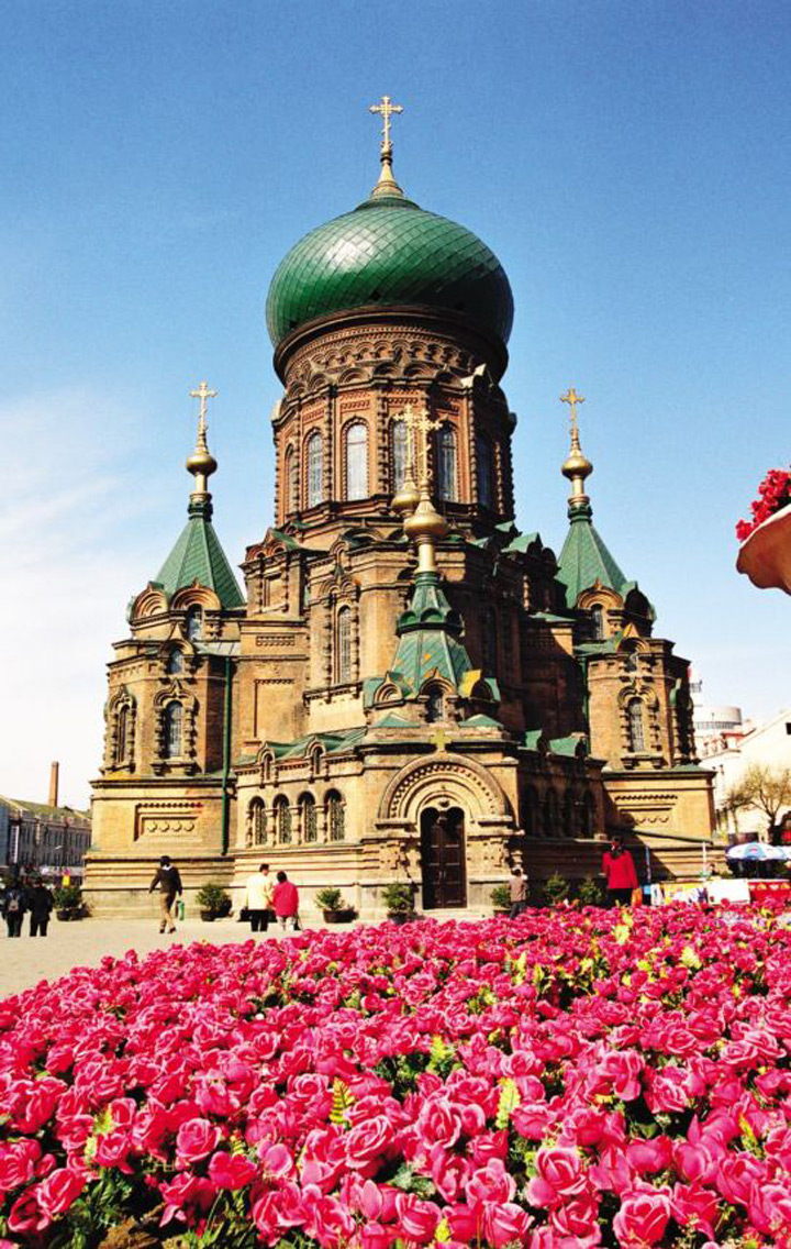 聖·索菲亞教堂是目前中國大陸保存最完美的典型拜占庭式建築。這座誕生近百年的建築充溢著迷人的色彩,教堂內的壁畫、吊燈、鐘樓及穹頂和唱詩台無一不顯示豐富多彩的人文景觀和匠心獨具的藝術特色。