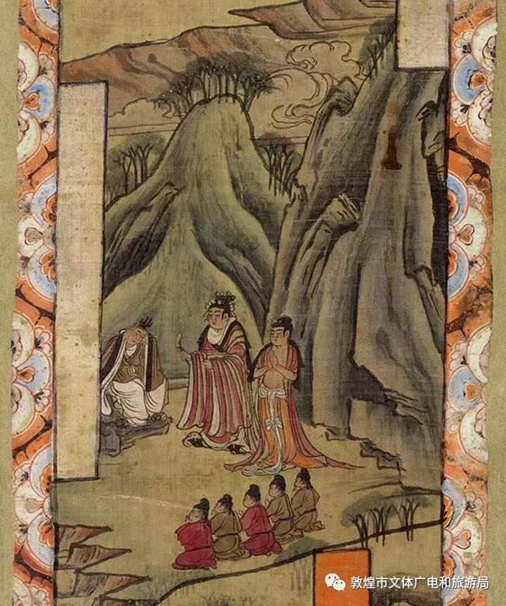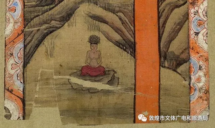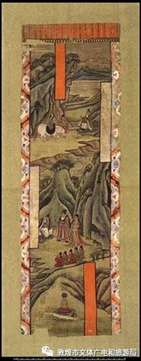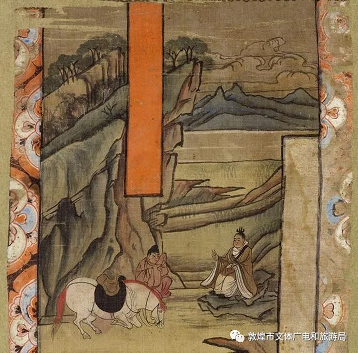藏經洞出土絹畫《佛傳故事之離別·剃度·苦修》,為絹本著色山水人物畫幡。現存于大英博物館。故事描繪太子出遊四門,見到老人、病人、死人,感傷人生無常,最後出北門遇沙門,聽聞“沙門之道,即舍家棄子,捐棄愛戀,斷絕六情,守戒無為”,決意出家修道,在29歲時,依靠天神幫助,離宮進山,開始苦修的故事。