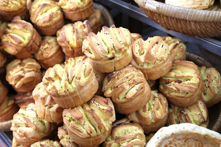 西寧街頭最常見的,莫過於焜鍋饃饃。發麵加入清油、香豆等調料,抹上紅麴、薑黃、香豆粉等色素,再層層疊疊卷成紅、黃、綠相間的麵團,放入圓形焜鍋內,埋入草木灰堆中慢慢烤製。焜鍋饃饃外脆內軟、酥香可口,是西寧人的主食,也是饋贈親友的禮品。