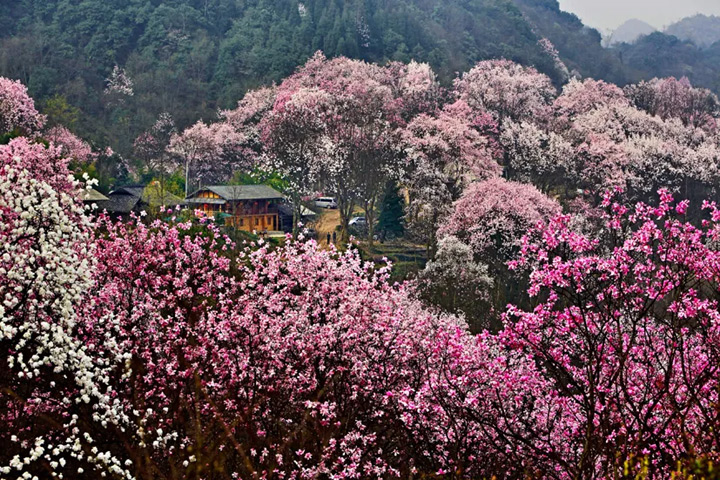 還有藥王谷,這裡藏著世界上最大的古辛夷花藥樹林。每年這個季節,花開繽紛,整個山谷都被染成了夢幻的粉色!