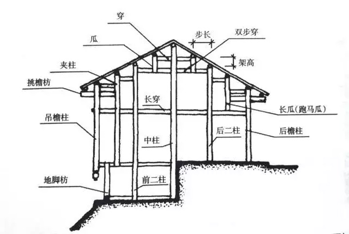 五柱四瓜帶夾柱木構架示意圖