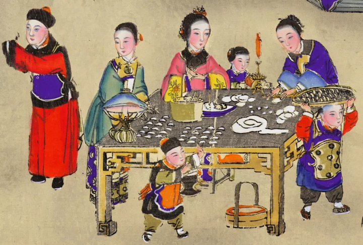 楊柳青年畫《新年多吉慶 闔家樂安然》(局部)中包餃子的場景