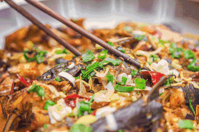 慶嶺活魚加工時從魚塘中撈起活蹦亂跳的金鱗大鯉,然後快刀解魚,所用調料中“把蒿”非常特別,是當地山間生長的野草,和南方艾葉相似,微帶藥香,隨著滿鍋的水逐漸濃縮,而深深滲透進魚肉中去。魚肉味鮮肉嫩,令人滿口生津。