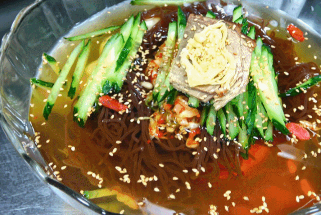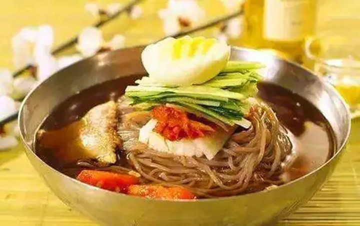 冷麵是用蕎麥麵或小麥麵加澱粉加水拌勻,壓成圓麵條,煮熟後浸以冷水,再去冷水伴牛肉片、辣椒、泡菜、梨或蘋果片、醬醋、香油等佐料,加入牛肉湯即成。