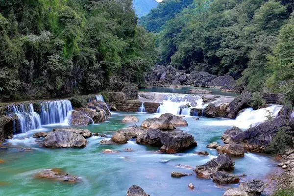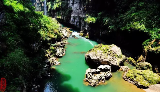 景區河谷兩岸山高林密,河水清澈透明,藤蔓交織、溶洞密布、喀斯特特徵明顯,沿溪而上,水里是天、樹、石的倩影,倏爾閃爍的銀光,是魚在歡暢地舞蹈,自然景觀奇特迷人,尤其以“藏字石”上顯現的“中國共產黨”五個字型堪稱世界地質奇觀,令人稱絕。其玄機深奧,誘人前往探秘。