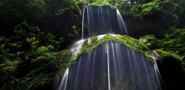 在峽尾地段的壁掛崖,苔蘚植被披綠掛紫、層層疊疊、延綿數里、如少女的舞裙,似含苞的荷蓮、像倒掛的海石花……一幅絢麗多彩的壁畫立在馬嶺河畔。在飛瀑下是一塊巨大的天然浴場,浴場上陽光揮灑,水霧瀰漫,如同人間瓊瑤。