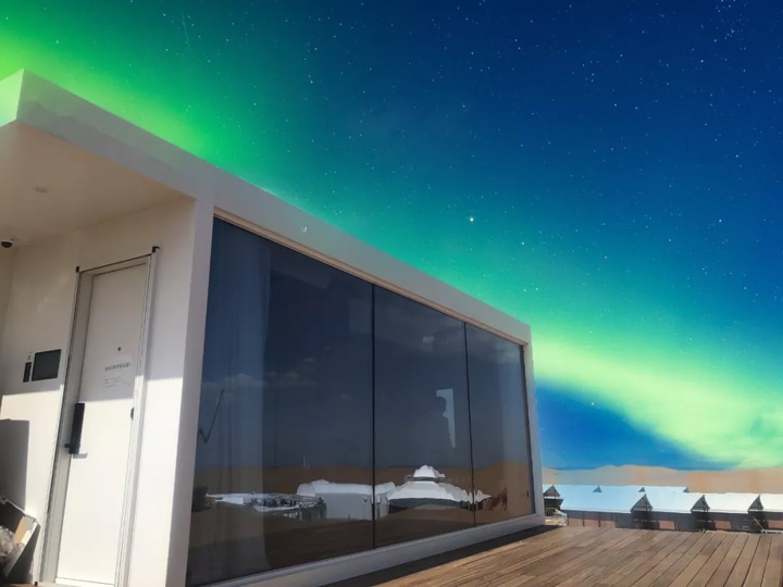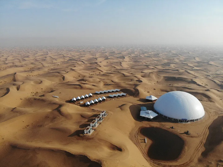 整體落地玻璃牆面通透清澈,坐落於沙丘之上,開窗俯瞰茫茫沙海,猶如白雲朵朵,在沙漠銀河中徜徉獨享。