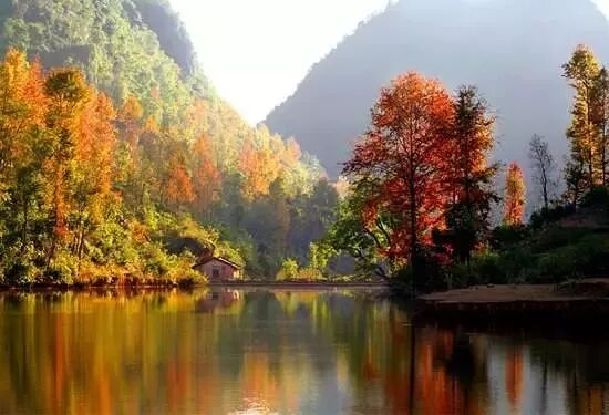 漫山遍野還是一片翠綠,摻雜其中的楓樹經過寒風蕩滌,染上了斑斕絢麗的色彩,楓林湖畔,馬匹時隱時現,宛如一幅濃墨重彩的畫卷。這個地方便是——德保紅葉森林公園。
