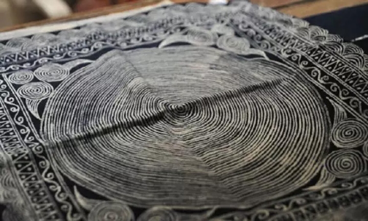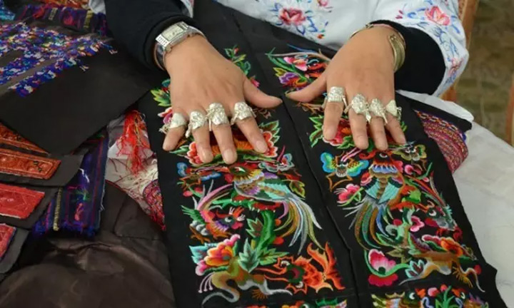 ▲苗族錫繡在材料上使用金屬“錫”最終來完成一件刺繡品,改變了人們傳統刺繡的用料觀念,形成了一種獨具特色的刺繡。