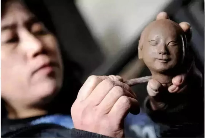 製作頭像和足的時候,將泥壓成薄片,放入模具中,