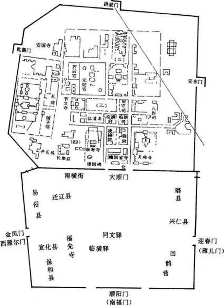 皇城分為外城和內城兩部分,建築多集中於南部,按《遼史》記載有官署、寺院、作坊等建築。位於皇城中間略偏東北是大內建築群,地勢居高臨下,是皇城中的宮殿區。在建築群的中部,有東西橫街,把大內分成南北兩樞密院。當時南北兩樞密院實行北樞密院以國制治契丹,南樞密院以漢制待漢人的政治制度。