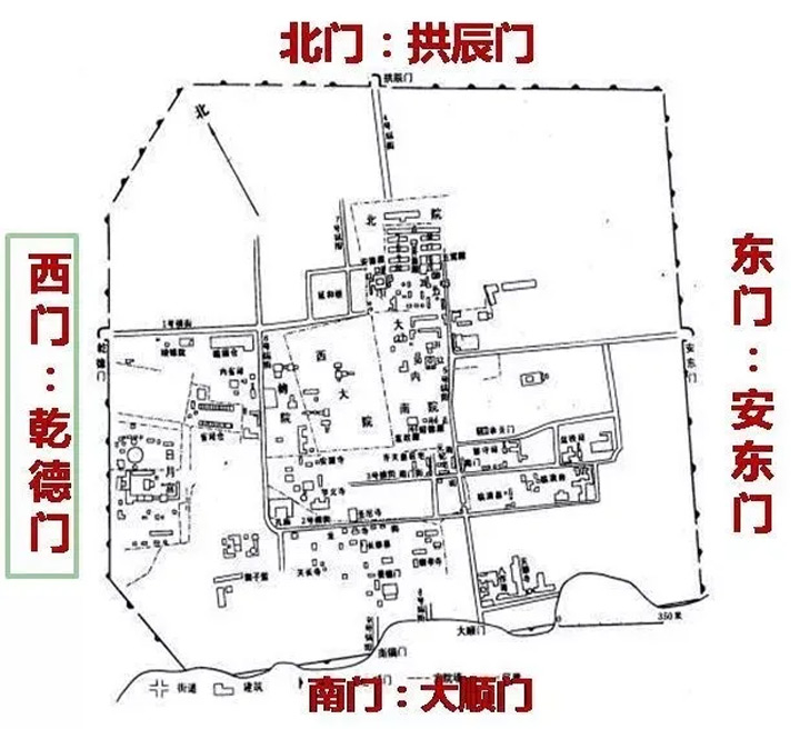 皇城共有四座城門,東為安東門,南為大順門,西為乾德門,北為拱辰門,除南面的大順門已被河水沖毀外,其餘3個城門遺址保存較好。