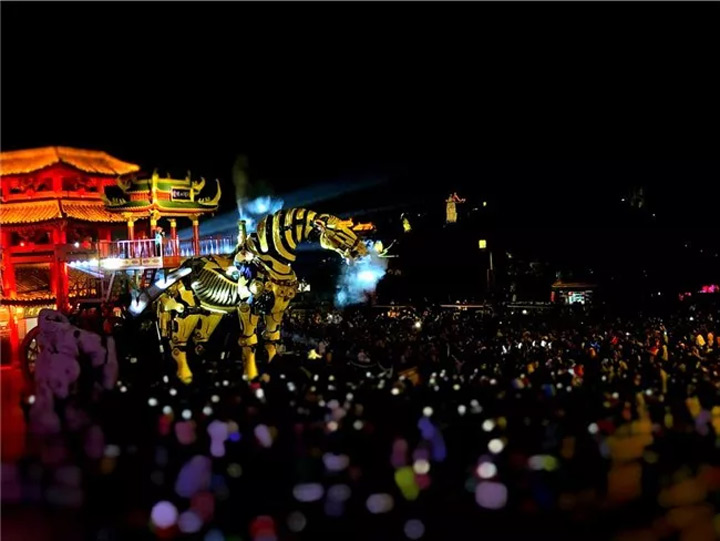夜晚的第一個精彩,存在於中華巨馬的身上,矯健的身姿在閃光燈匯成的星星海裡更顯神采奕奕。一聲精氣十足的嘶鳴聲,拉開了清明上河園夜遊的序幕。