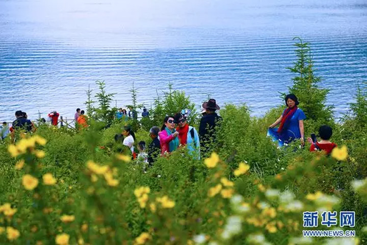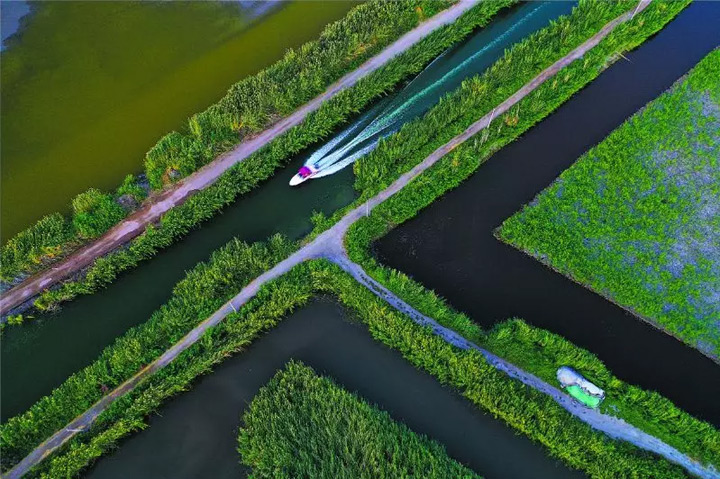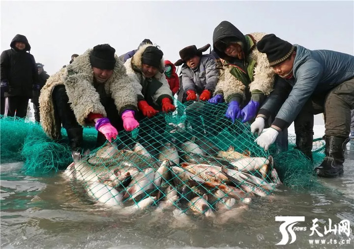 漁民在博斯騰湖大河口(西海漁村)景區捕魚。