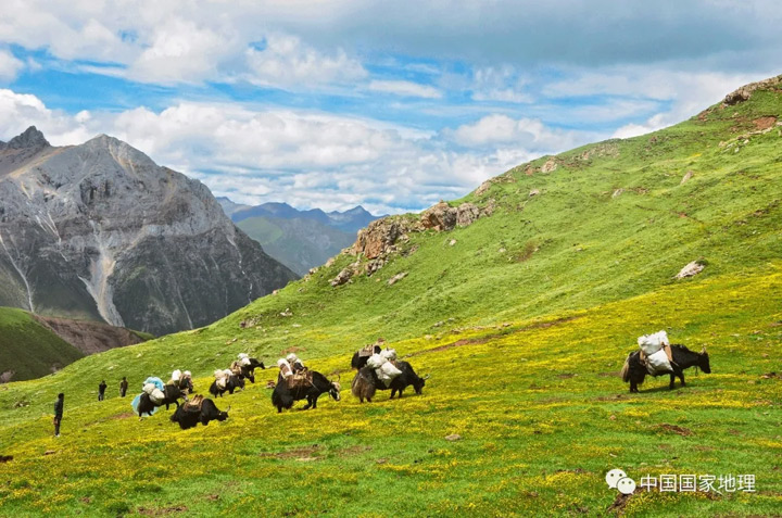 綠如碧玉的海子、緩緩移動的犛牛和羊群