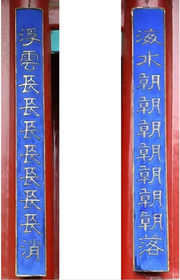 此副對聯利用中國漢字一字多音、一字多義的特點,疊音疊字,描繪了海潮漲落,浮雲長消的自然景象,顯示了自然界變幻多姿的景色。