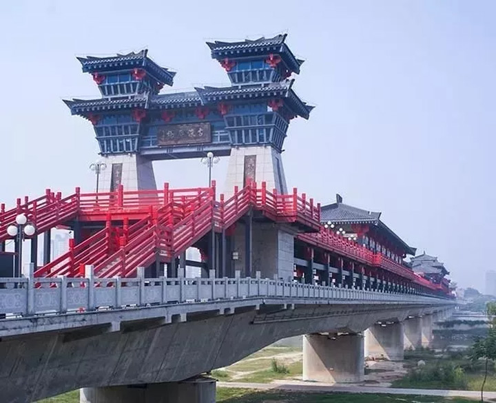 這座橋位於咸陽市,北起渭陽路,南至渭河南岸,橫跨渭河,是一座氣勢不凡的仿古橋樑,於2017年建成並投入使用。廊橋全長為748公尺,寬度為14公尺,雙層設計,整座橋樑帶著濃重的秦代建築風格。
