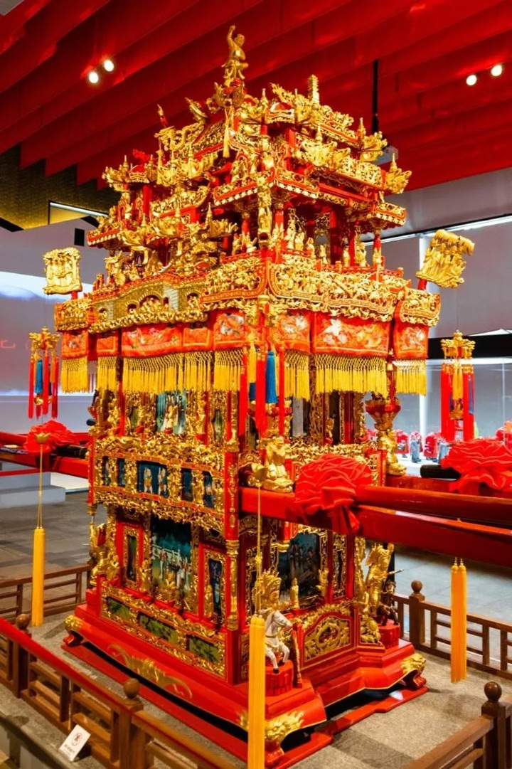 華貴雍容、朱漆雕花的“萬工轎”。花轎是十里紅妝最重要的器物。在寧海人看來,花轎是新娘地位的一種直接體現,代表著明媒正娶。因此能夠坐在精美的花轎裡,在十里紅妝的簇擁下出嫁也就成了一個女子一生中最為風光的時刻。富家大戶中的女子,會一生自豪地敘述她坐花轎出嫁時的情景。尤其是在小妾面前,用以強調她的正主地位。