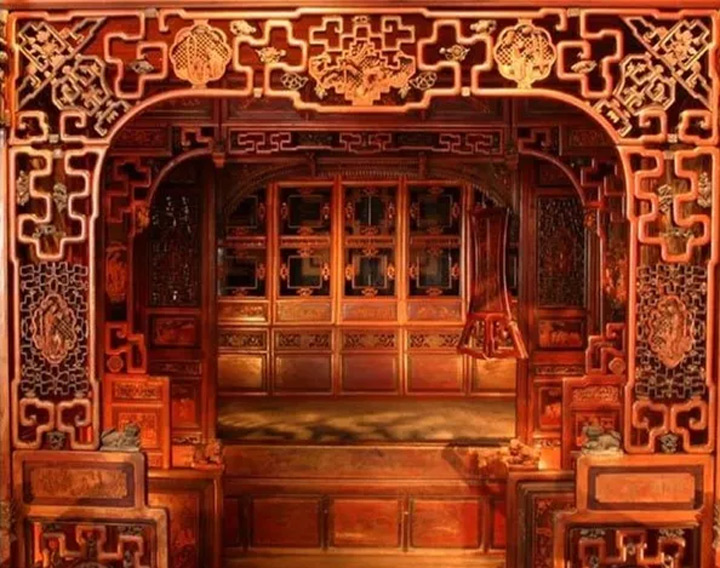 錯彩鏤金、以千日之工打造的“千工床”。喜床也是紅妝中必不可少最為講究的傢俱。婚床往往朱金木雕,泥金彩漆,其豪華和精緻的程度可以與明清帝王的禦床相媲美。豪門大戶相互攀比不惜為此耗銀萬兩。工匠們往往歷時數年甚至數十年才能製作出一張床。紅妝喜床也因此稱為“千工床”,千工床的前部有一個小平臺稱為踏步。踏步上面設有飄簷花罩和卷封頂,右邊常放一隻小廚上置鐘、帽筒、花瓶、鏡箱、茶具、燈檯;左邊則放一隻馬桶箱。後半部才是臥床本體,除了再一道雕花門罩、垂帶、遮枕外,床內有的還設有書架擱板、角櫥、錢箱、點心盒、防身器具等。