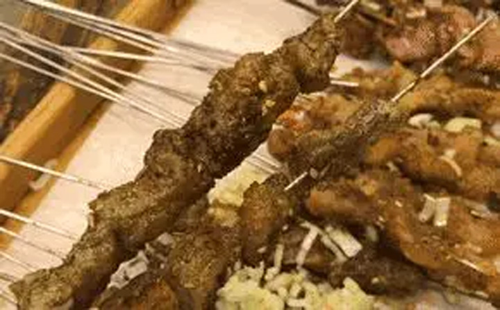 而鶴崗小串則是在食材上放辣椒麵、孜然、鹽。其次,從食材本身來講。鶴崗的烤串以牛身上的各部位為主,牛肉串、牛骨髓、牛生筋等。種類豐富且每種都有不同的口感特色。第三,從穿串方式來講。大多烤肉串是切成小塊狀穿串兒的,而鶴崗肉串用切成薄片來穿串兒的,這樣烤製出來的肉串易熟還好入味兒。