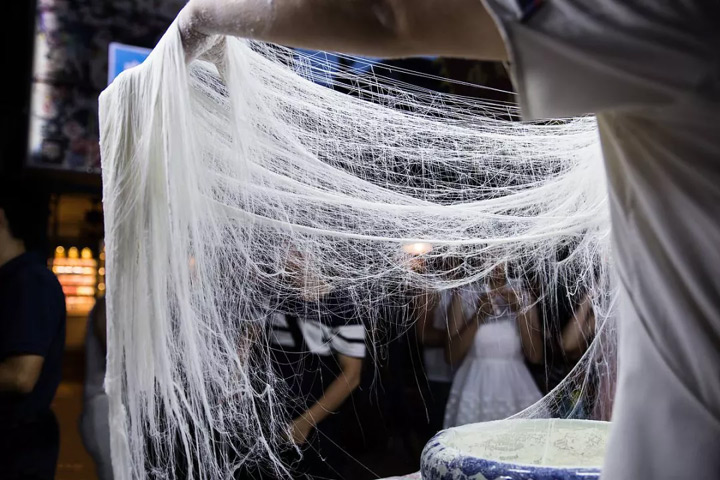 由於抻麵的姿勢,如氣壯山河一般,抻出的面細如髮絲,猶如交織在一起的龍鬚,故名龍鬚麵。