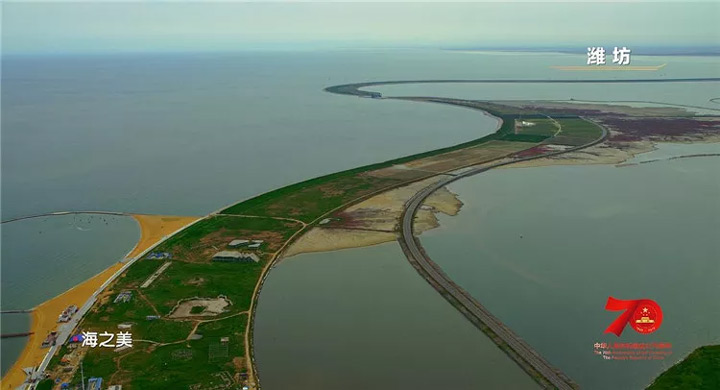 橋身從海岸探入如彎月般的青島灣深處