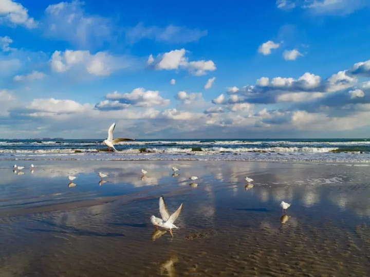 日照海濱,天晴朗、海湛藍、沙細軟