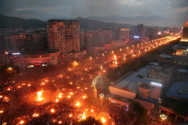 彝族火把節是彝族地區的傳統節日,每年農曆六月二十四日舉行。男女青年點燃松木製成的火把,到村寨田間活動,邊走邊把松香撒向火把,或進行集會,唱歌跳舞,或賽馬、鬥牛、摔跤。