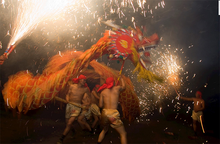 成都洛帶“火龍燈舞”起源於南宋,龍、燈、舞、火焰融於一體,場面極其華美絢麗,使其成為了一種神奇、美妙、驚險的藝術表演。