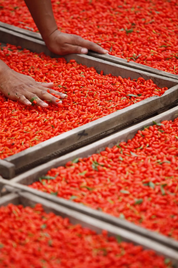 ▲ 寧夏枸杞名氣大,自然出現了“冒牌貨”。一個最簡單的鑒定寧夏枸杞的方法是“緊握法”。抓一把枸杞,緊緊攥住,鬆開手,若散開就是寧夏枸杞,黏成一團則是“李鬼”。寧夏枸杞之所以成為藥用枸杞的首選,也是因為其糖分不會太高。攝影/李鵬