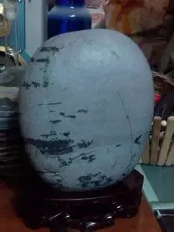 額河石,出自新疆阿勒泰市富蘊縣的額爾其斯河。該石為額爾齊斯河床中的卵石,質地堅硬,光滑細膩,具有玉質感;紋理線條流暢,豐富多變,構圖奇美;色彩鮮豔純樸,體型飽滿厚重。