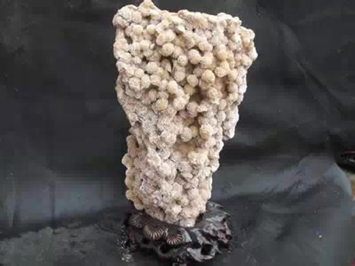 鐘乳石,出自一些方解石脈晶洞中。該石形態為菜花狀、球狀集合體,一種呈白色,色純乾淨,另一種呈桔黃色,很鮮豔,均頗具觀賞價值。 伊犁州特克斯縣城以南51公里處的原始森林中有一天然石灰岩溶洞,地下溶洞長1.8公里,寬3~12公尺,洞頂、洞壁及底部生長著各色鐘乳石,自然石景參差錯落,形狀千姿百態,顏色以乳白、雪白、油黃為主,也有紅、綠、藍、黑等色,整體色彩絢麗多樣。