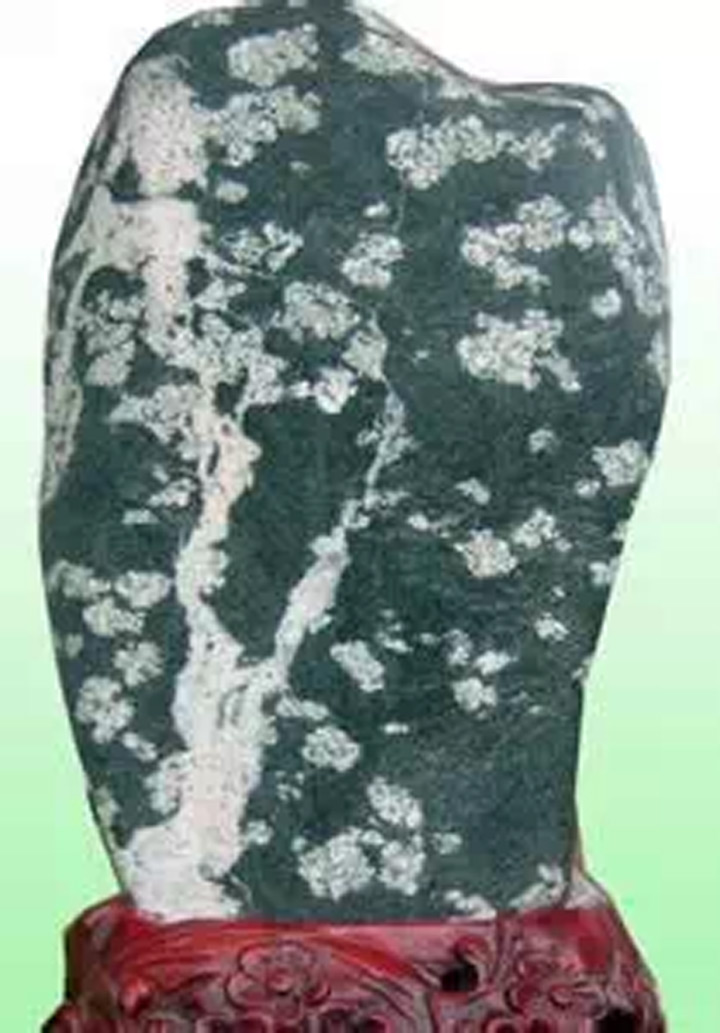 梅花石,出自新疆阿勒泰地區南側準噶爾盆地克拉美麗地區。該石質地為玄武岩,石中的氣孔和裂隙被方解石、綠廉石充填後,呈大小不等的圓球狀和細脈狀,在岩石表面形成似梅花盛開的圖案。